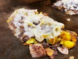 Cheesesteak with fried onions, cooper sharp cheese, served with French fries and medium soda.